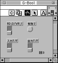 サブVI[G-Bool]は、[入力T/F]に"1"が入力されると、その後[RD;0/WR;1]に1が再入力されるまで[出力T/F]コネクタから連続して出力されます。