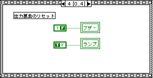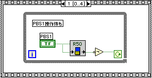 のように[R50]の出力を反転させてワイヤリングします。シーケンス0番で[R50]の出力はfalse"0"が保持されていますから,このシーケンスでは,フロントパネルのPBS1をクリックするまでループは実行を続けます。