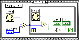 [Tick 1]はループ実行前に1回だけ実行され,フロンとパネルの制御器[ミリ秒待ち]に入力されたタイマー設定時間のカウントと加算した値を[Tick 2]のカウントが越えるまでループが実行されます。