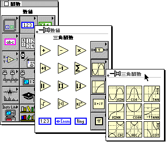 今回も関数パレット中のアイテムはLabVIEW3.xと同じで,特筆するような関数はありません。パレットの中にサブパレットを設けて入れ子構造になったので,当初のうちは必要なVIを探すのにとまどいを感じますが,慣れれば逆に便利です。(図7)